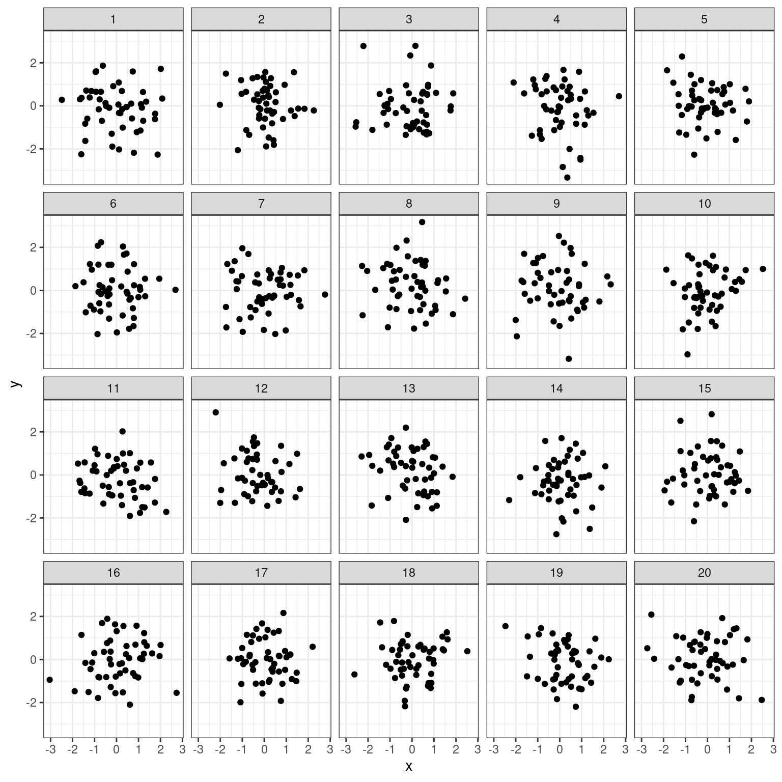 - Create a faceted scatterplot that shows the relationship between each of the 20 sets of pairs of random variables