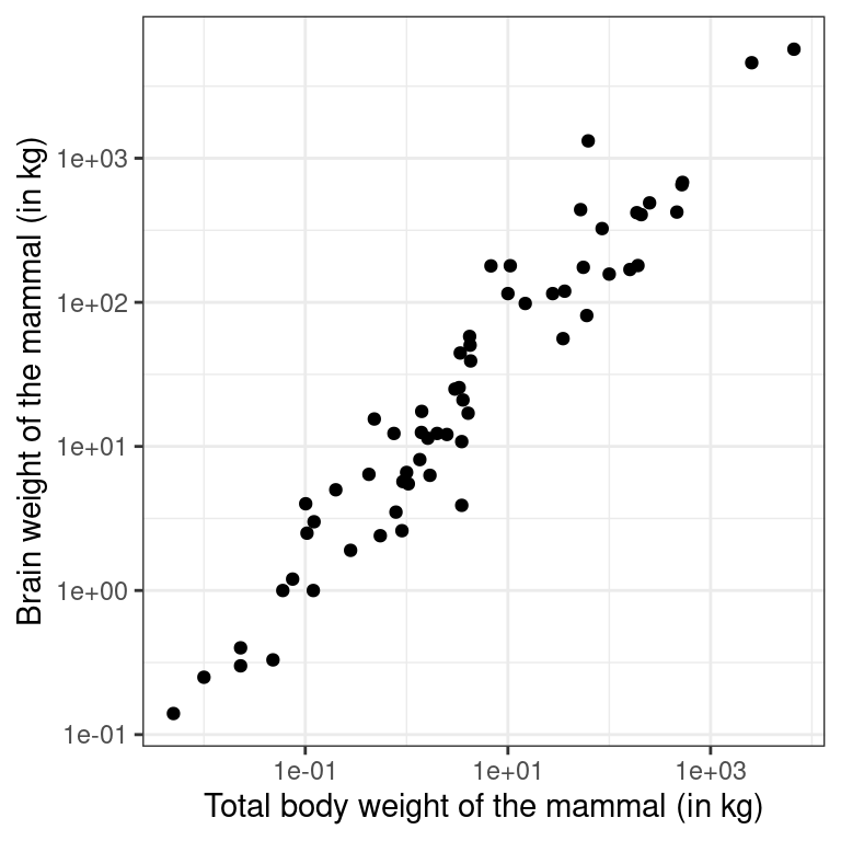 coord_trans()to create a scatterplot showing how a mammal’s brain weight varies as a function of its body weight, where both the x and y axes are on a"log10"scale.