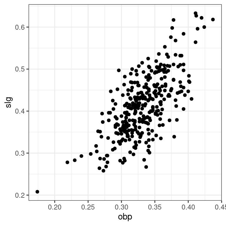 filter()to create a scatterplot forslgas a function ofobpamong players who had at least 200 at-bats.