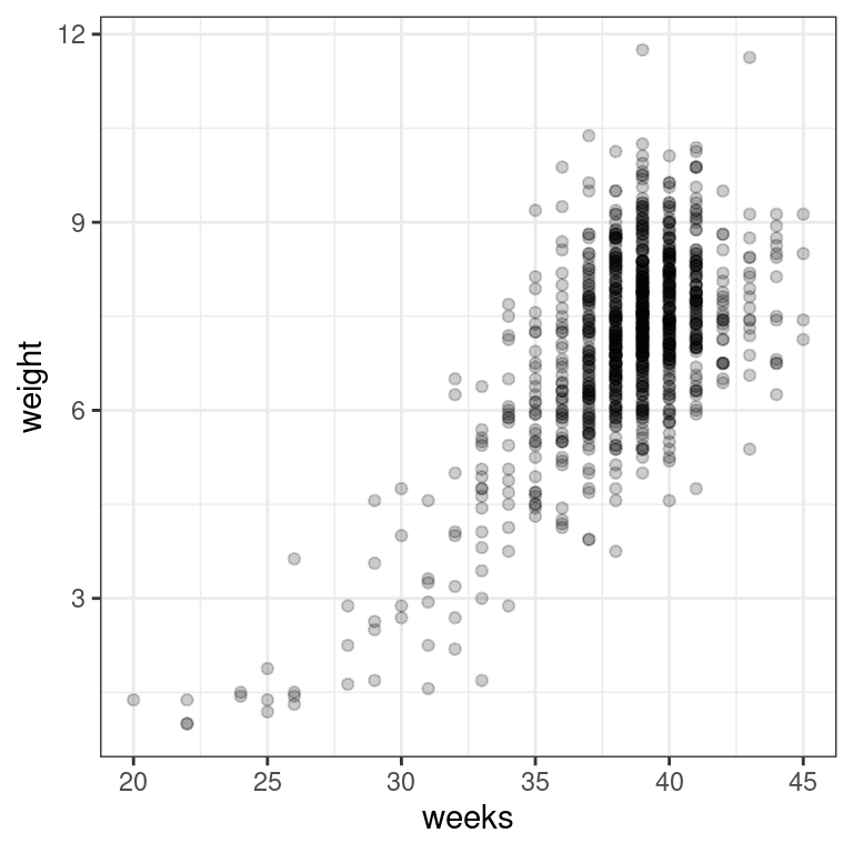 ggplot(data = ncbirths, aes(y = weight, x = weeks)) +