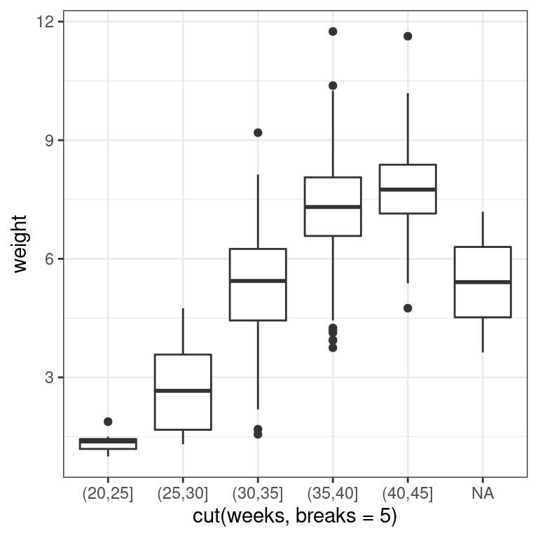 aes(x = cut(weeks, breaks = 5), y = weight)) +