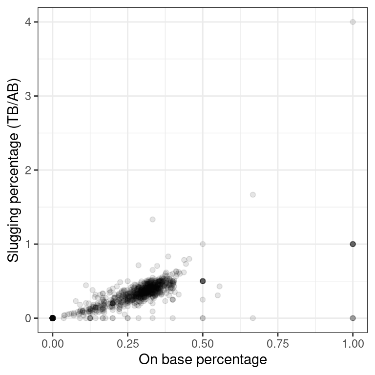 labs(y = "Slugging percentage (TB/AB)", x = "On base percentage" )