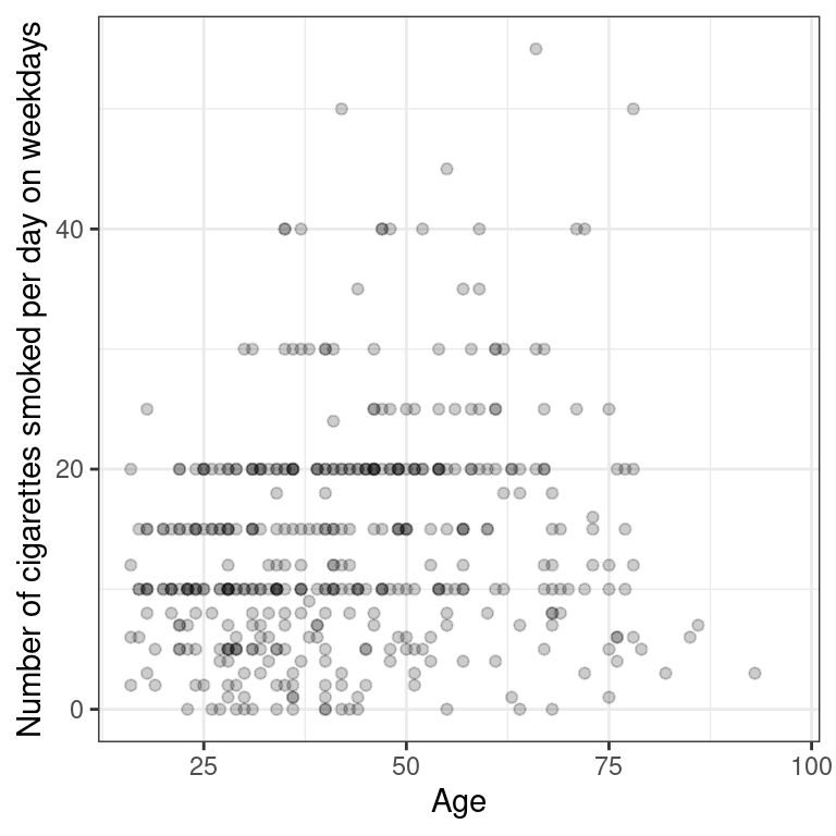 labs(x = "Age", y = "Number of cigarettes smoked per day on weekdays")Warning: Removed 1270 rows containing missing values (geom_point).